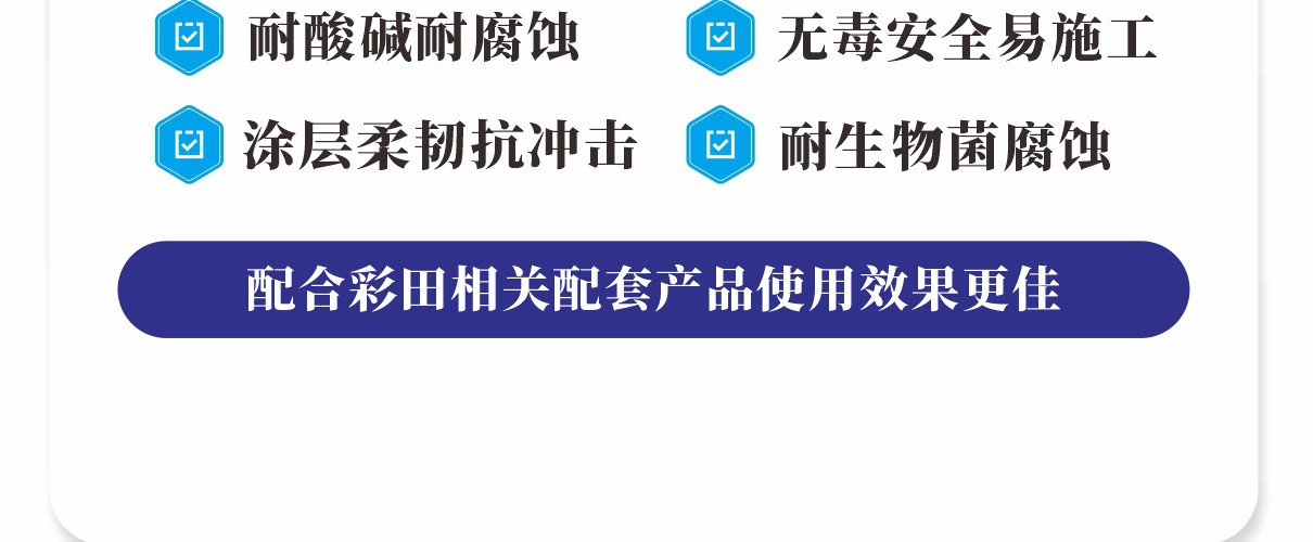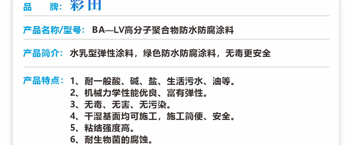 彩田的高分子聚合物防水防腐涂料是一種水乳型彈性涂料,主要用于混凝土結構的防腐防水。BA-LV高分子聚合物防水防腐涂料是綠色防水防腐涂料,無毒無污染,在混凝土干濕面上均可施工,施工后的涂層有彈性,施工方便,干燥快,粘結力強。