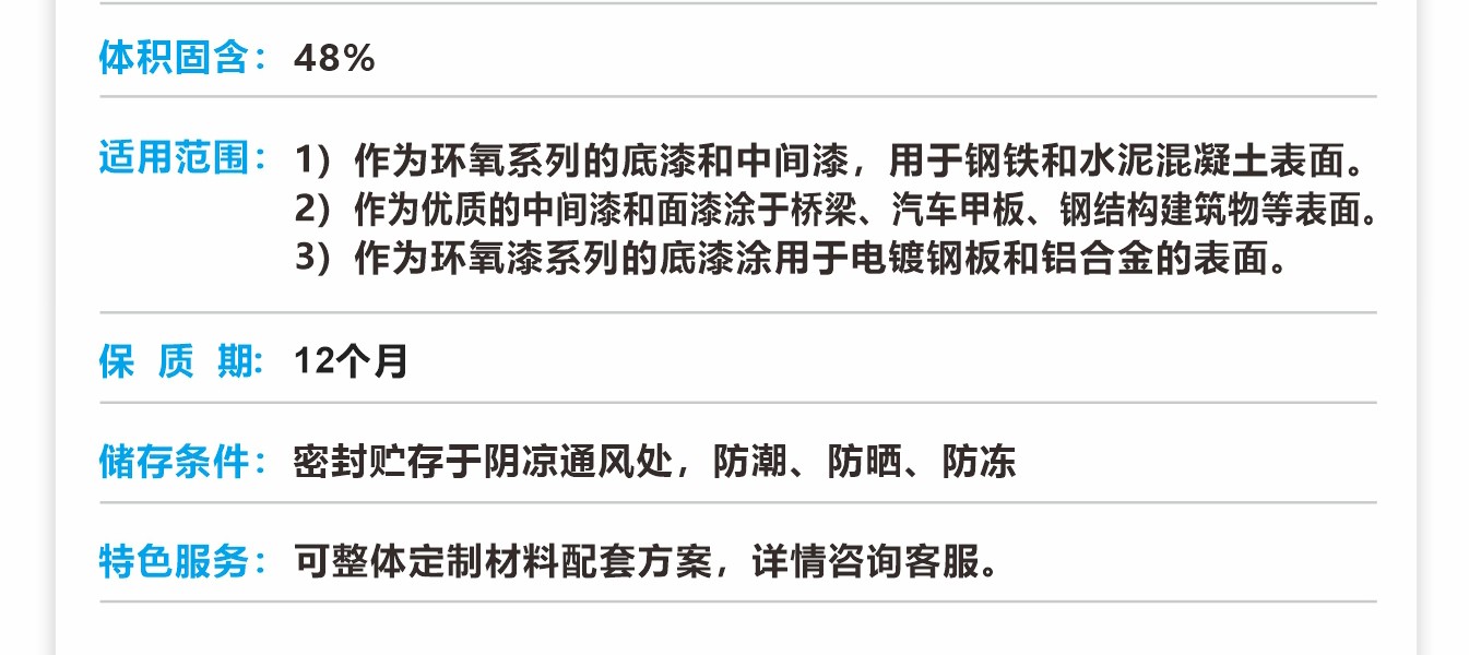 由云母氧化鐵為顏料配制而成的雙組份環氧漆,本品具有耐海水、耐腐蝕、抗碰撞、耐礦物油、脂肪烴及多種化學品性能。 適用范圍: 1) 作為環氧系列的底漆和中間漆,用于鋼鐵和水泥混凝土表面。 2 作為優質的中間漆和面漆涂于橋梁、汽車甲板、鋼結構建筑物等表面。 3) 作為環氧漆系列的底漆涂用于電鍍鋼板和鋁合金的表面。